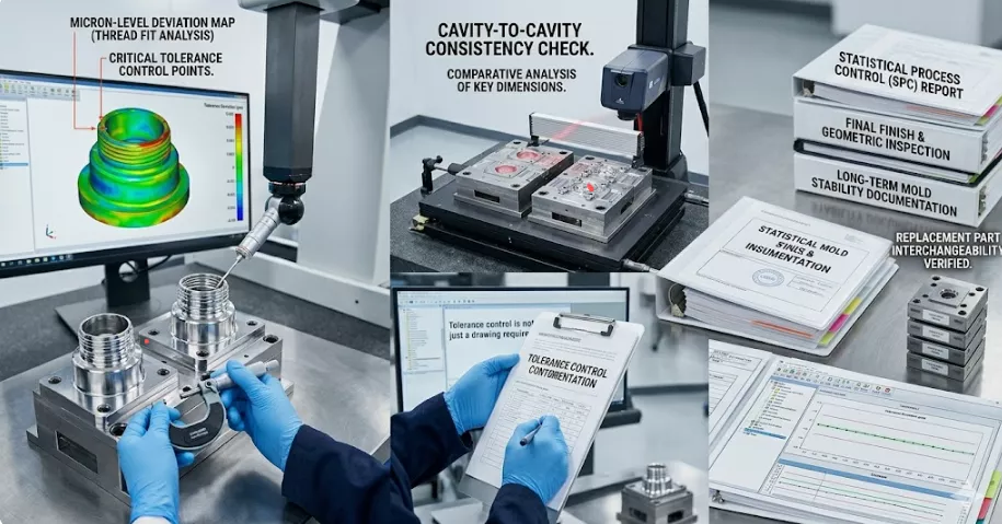 Dans la fabrication de moules de précision, le contrôle des tolérances détermine quatre résultats pratiques : les performances d"ajustement et d"étanchéité, la cohérence d"une empreinte à l"autre, l"interchangeabilité des pièces de rechange et la stabilité du moule à long terme. Les problèmes tels qu"un ajustement de filetage incohérent, des fuites d"étanchéité, une variation du poids de la cavité, une dérive dimensionnelle, une sensation d"assemblage instable et un ajustement excessif sur banc après le remplacement ressemblent souvent au premier abord à des problèmes de moulage. Cependant, dans de nombreux projets, ils commencent bien plus tôt, au niveau du contrôle des tolérances fonctionnelles des composants du moule eux-mêmes.